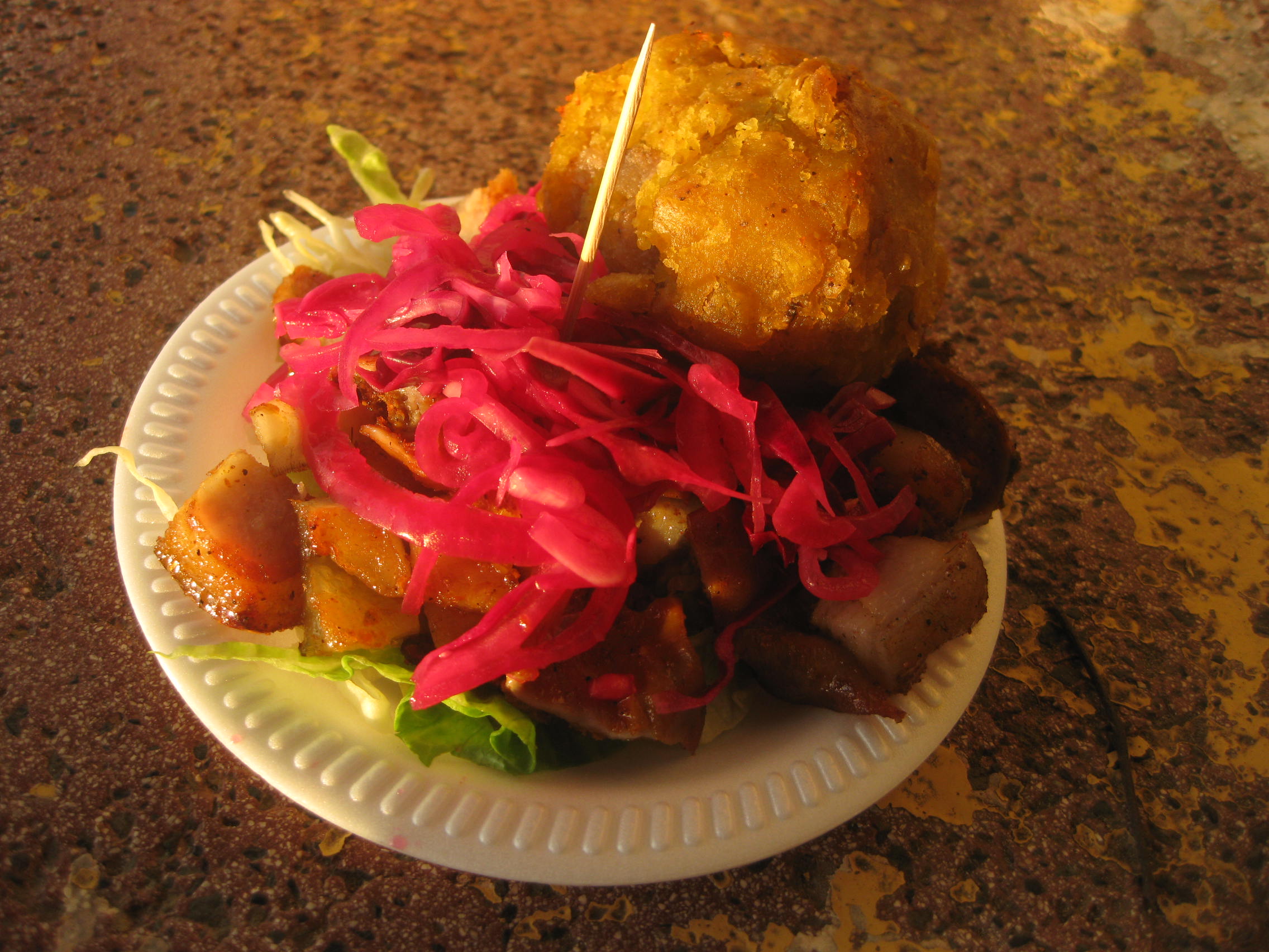 Puerto López – Kulinarisches – Ecuador – Bolón 13/05/2015 2272 × 1704 Ecuador: Reisetipp südliche Küste – Traumstrände, Party-Städtchen und Kulinarisches Gegrilltes Rindsfleisch, Schweineschwarte und die Kugel ist ein Bolón aus Essbanane, typisch für die Küstenregion Ecuadors